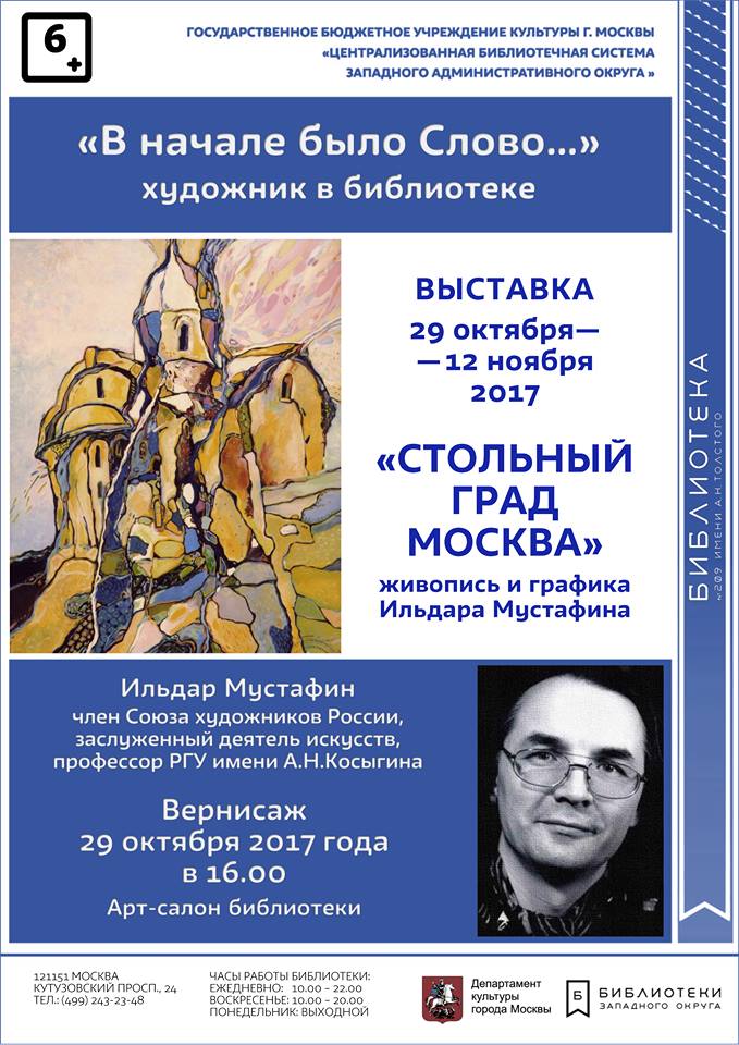 29 октября Москве, в Арт-салоне библиотеки имени А.Н. Толстого открывается выставка "Стольный град Москва. Живопись и графика Ильдара Мустафина".