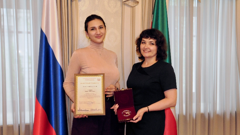 Встреча прошла в Полпредстве Татарстана. Наиля Рафаелевна поздравила девушку с победой, вручила Почетную грамоту от имени заместителя Премьер-министра Республики Татарстан – Полномочного представителя РТ в РФ Равиля Ахметшина и памятные подарки.