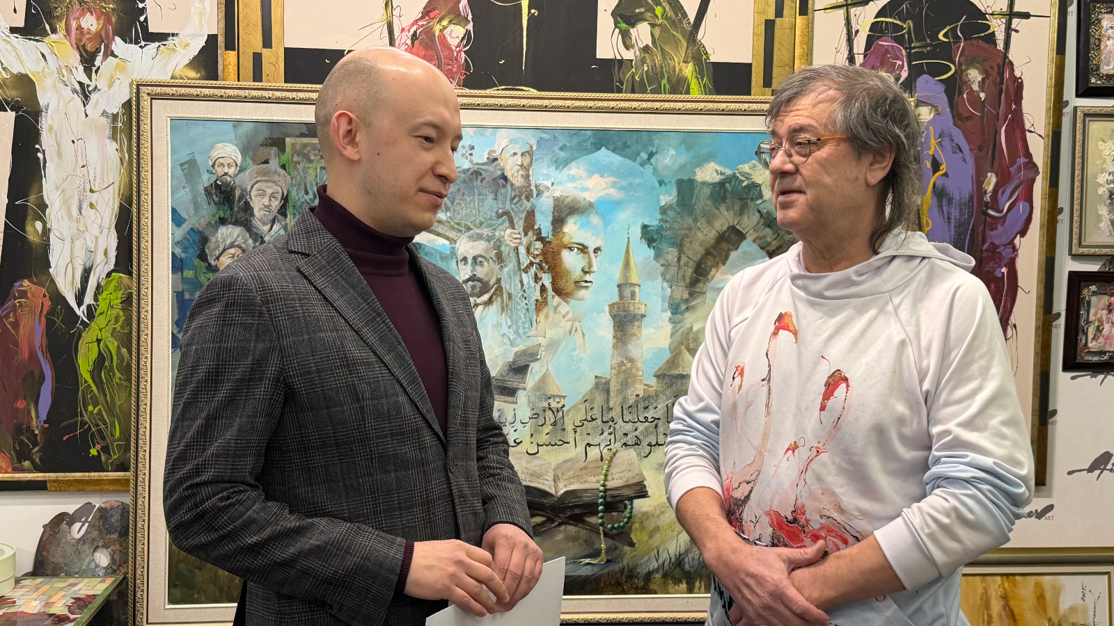 В мастерской юбиляра поздравил заместитель Полномочного представителя Республики Татарстан в РФ Фаннур Гарифуллин. Добрые пожелания по телефону ему сказал и заместитель Премьер-министр РТ – Полномочный представитель РТ в РФ Равиль Ахметшин, находящийся в Казани.