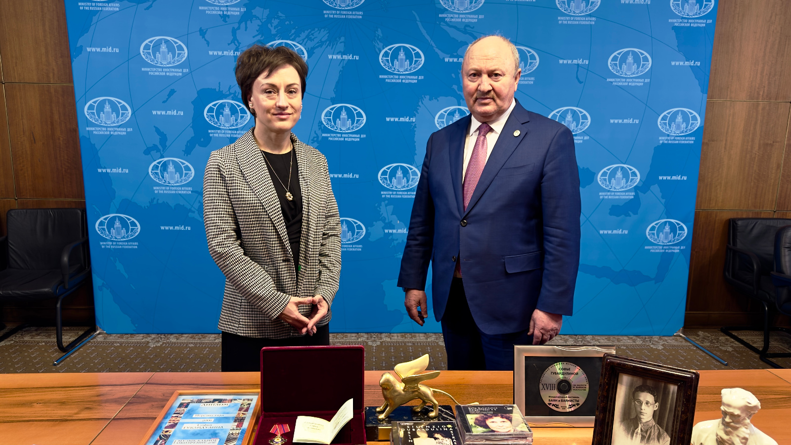 Сегодня в МИД России заместителю Премьер-министра Республики Татарстан – Полномочному представителю РТ в РФ Равилю Ахметшину передали личные вещи всемирно известного композитора Софии Губайдулиной.