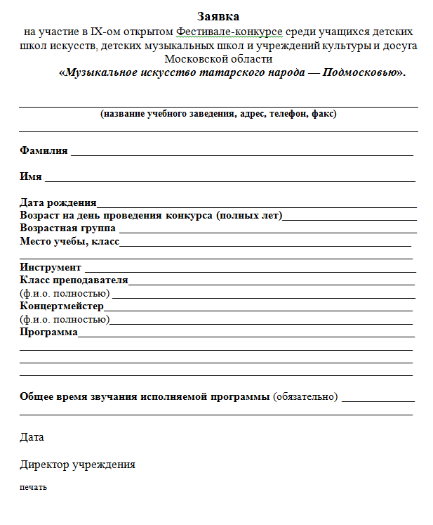 Заявка должна быть заполнена печатным текстом по предложенной форме на каждого участника с указанием полных лет и датой рождения.