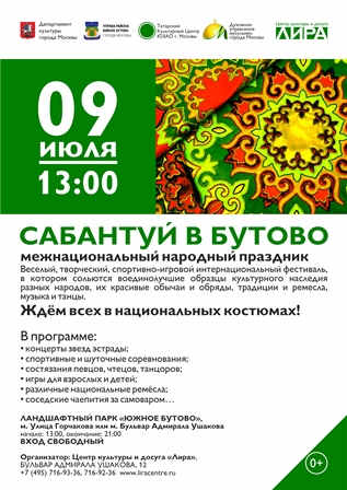 Сабантуй в Бутово пройдет впервые, но задуман как ежегодный интернациональный, творческий, спортивно-игровой, гуманитарный форум, в котором представлены лучшие образцы культурного наследия разных народов, их красивые обычаи и обряды, традиции и ремесла, музыка и танцы.