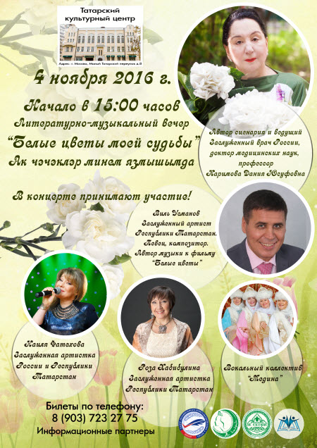 4 ноября 2016 года в Татарском культурном центре Москвы пройдет литературно-музыкальный вечер «Белые цветы в моей судьбе», посвященный юбилею заслуженного врача России, доктора медицинских наук, профессору Дании Юсуфовны Каримовой.