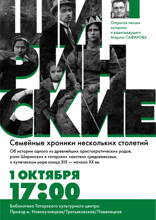 1 октября 2016 года в 17:00 в библиотеке Татарского культурного центра Москвы (Доме Асадуллаева) состоится открытая лекция историка и радиоведущего Марата Сафарова «Ширинские. Семейные хроники нескольких столетий», посвященная одному из самых древних татарских аристократических родов.