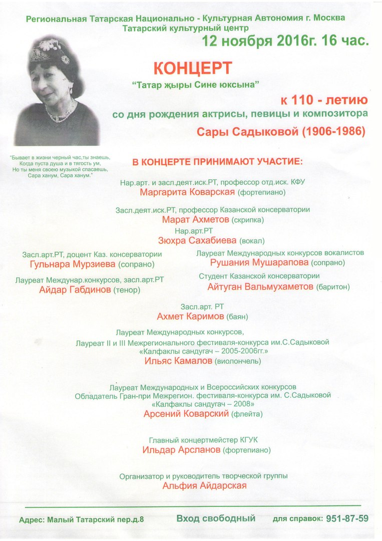 12 ноября 2016 года Татарском культурном центре (ТКЦ) Москвы пройдет концерт «Татар җыры Сине юксына», посвященный 110-летию со дня рождения актрисы, певицы и композитора Сары Садыковой.