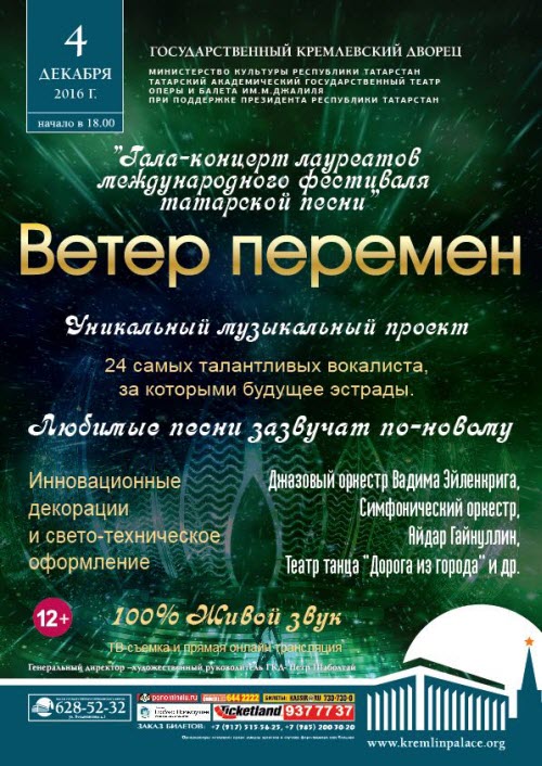 4 декабря 2016 года в Государственном Кремлевском Дворце пройдет музыкальный фестиваль татарской песни "Ветер перемен" («Yзгәреш җиле»).