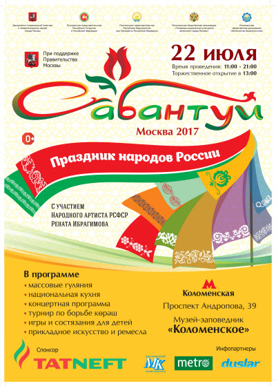 22 июля 2017 года в Московском государственном музее-заповеднике «Коломенское» пройдет общегородской праздник "Сабантуй-2017". На этом одном из исторических и живописных мест российской столицы он пройдет в седьмой раз.
