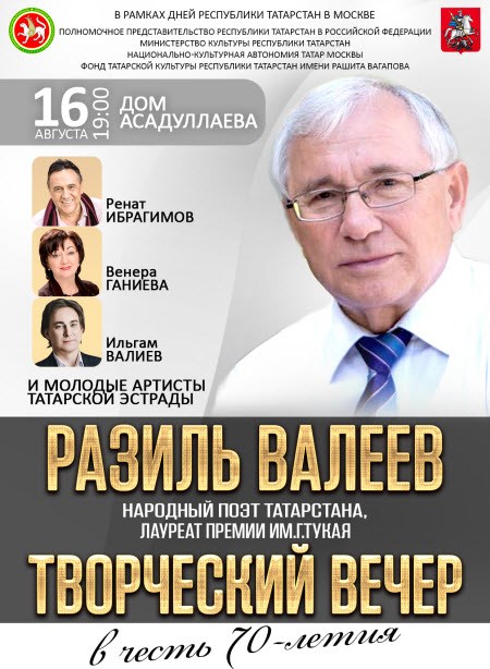 16 августа в Москве в рамках Дней культуры Республики Татарстан состоится творческий вечер общественного и государственного деятеля, народного поэта Республики Татарстан Разиля Исмагиловича Валеева.